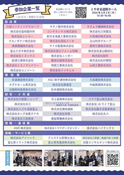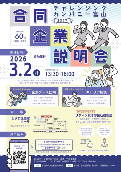 富山県中小企業団体中央会では、若者の県内企業への就職促進を目的に、「チャレンジングカンパニー富山2027合同企業説明会」を開催します。