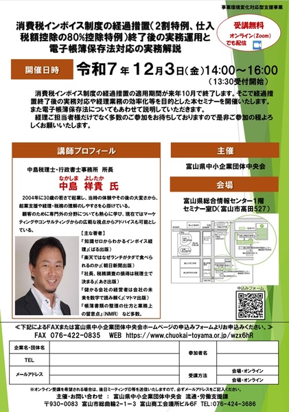 消費税インボイス制度の経過措置の適用期間が来年10月で終了します。そこで経過措置終了後の実務対応や経理業務の効率化等を目的とした本セミナーを開催いたします。また電子帳簿保存法についてもあわせて説明していただきます。