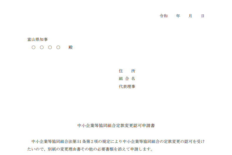 許認可届出様式[認可申請/定款変更認可申請書] トップページ 組合制度の案内 許認可届出様式 許認可届出様式[認可申請/定款変更認可申請書] 事業協同組合(企業組合) 組合制度のご案内 組合制度の概要 組合庶務一覧 許認可届出様式 組合運営Q&A 県内の組合事例