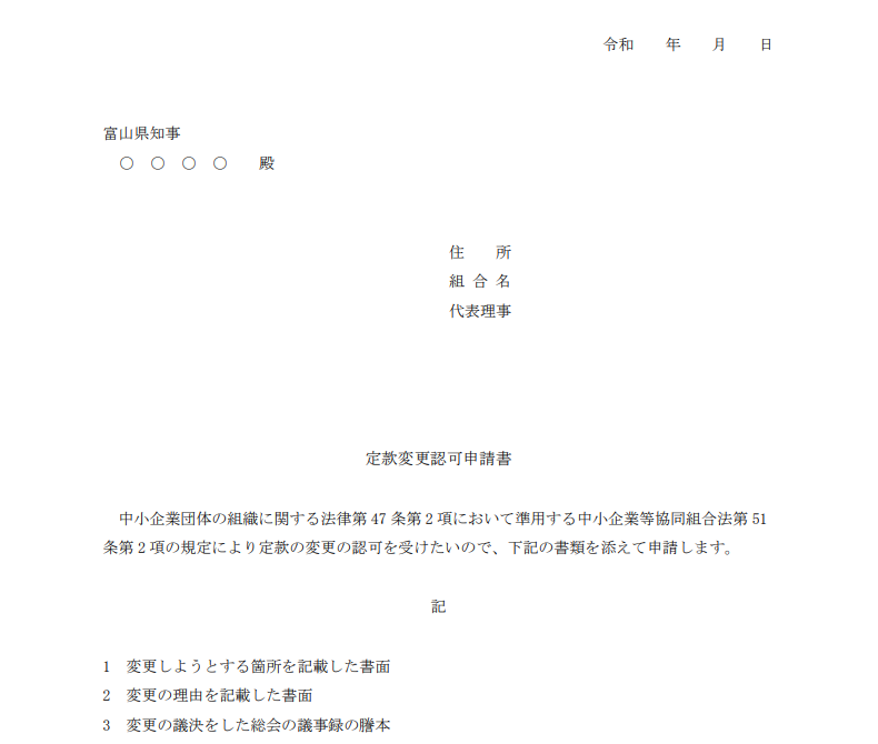 許認可届出様式[認可申請/定款変更認可申請書] トップページ 組合制度の案内 許認可届出様式 許認可届出様式[認可申請/定款変更認可申請書] 商工組合 組合制度のご案内 組合制度の概要 組合庶務一覧 許認可届出様式 組合運営Q&A 県内の組合事例