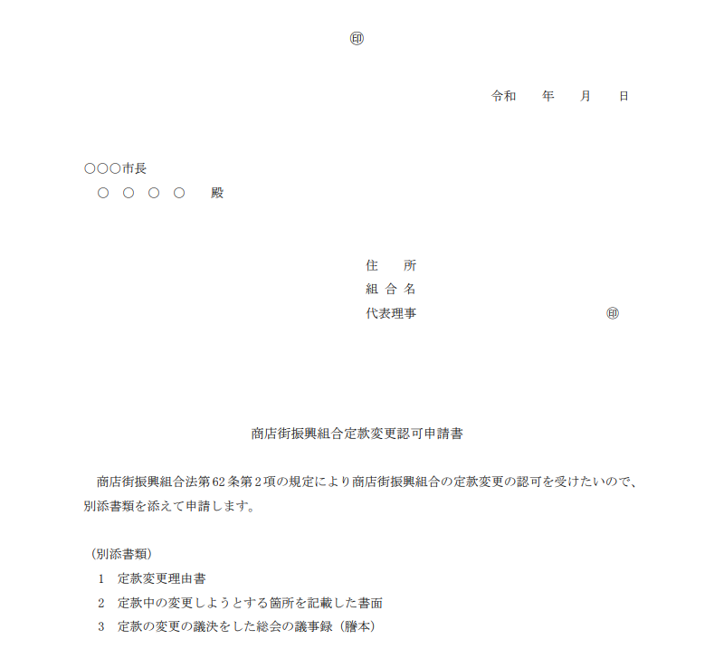 許認可届出様式[認可申請/定款変更認可申請書] トップページ 組合制度の案内 許認可届出様式 許認可届出様式[認可申請/定款変更認可申請書] 商店街振興組合 組合制度のご案内 組合制度の概要 組合庶務一覧 許認可届出様式 組合運営Q&A 県内の組合事例