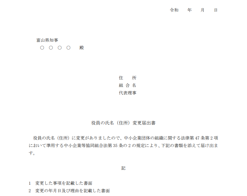 許認可届出様式[届出/役員変更届書] トップページ 組合制度の案内 許認可届出様式 許認可届出様式[届出/役員変更届書] 商工組合 組合制度のご案内 組合制度の概要 組合庶務一覧 許認可届出様式 組合運営Q&A 県内の組合事例