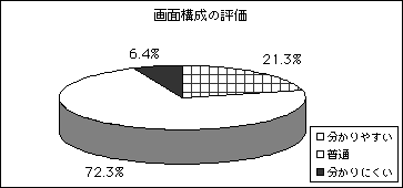 画面構成の評価について、「普通」72.3%、「分かりやすい」21.3%、「分かりにくい」6.4%となった。