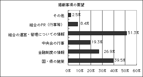 ホームページに掲載してほしい事項についての希望は、「組合の運営・管理についての情報」51.3%、「国・県の施策」39.5%、「金融制度の情報」26.9%という結果となった。