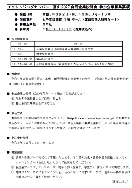 富山県中小企業団体中央会では、県内中小企業の人材確保に資するため、求人企業と就職をめざす学生等が一同に会する合同企業説明会(チャレンジングカンパニー富山2027)を開催します。